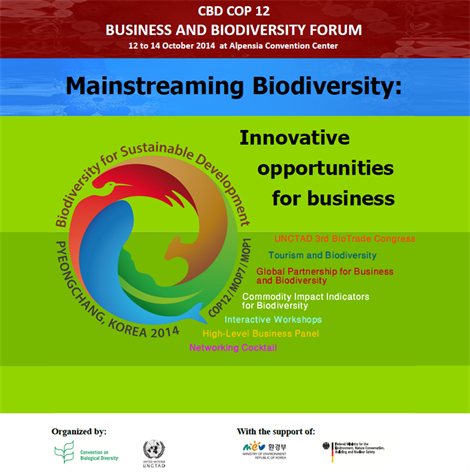 On 12-14 October 2014, the Secretariat of the Convention on Biological Diversity hosted a three day business and biodiversity forum in parallel with COP 12. Approximately 250 people participated in the various elements of the forum over the course of the three days. This included official representatives of Parties, businesses, associations, NGOs, academia and other stakeholder groups, and represented well over 30 countries. On day one, parallel events were organised to discuss the four key themes of COP 12; BioTrade, Sustainable Tourism, Commodity Production and the Global Partnership. On days two and three, discussion sessions focused on the issues and concerns surrounding the implementation of the aforementioned key themes.