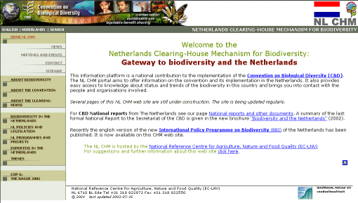 | The Netherlands CHM National Focal Point Toolkit The Netherlands CHM website (http://www.biodiversity-chm.nl/) was designed according to the principle that the end-user should be able to act as the webmaster and, where possible, also be able to update the content of the site according to needs, without the need for high technical expertise or steep learning curves. The Netherlands CHM website was produced by the National Reference Centre for Agriculture, Nature and Food Security (EC LNV) in co-operation with AIDEnvironment. In its design, it emphasizes the philosophy that a website should be: easy to use, easy to adapt, 'light' in terms of upload-time and technical complexity, inclusive of an easily adaptable database, multilingual, built using a no-nonsense architecture, and inexpensive to produce and maintain. The Netherlands CHM has developed a Toolkit with AIDEnvironment to establish