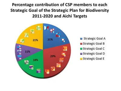 Concerning the five Strategic Goals that encompass the 20 Aichi Targets, Goal B, which addresses the underlying causes of biodiversity loss by mainstreaming biodiversity across government and society, received the largest amount of contributions from CSP members (28% of the total contributions),. On the other hand, Goal D, which seeks to enhance the benefits to all from biodiversity and ecosystem services, received the least contributions from CSP members (11 % of the total contributions),. However, it is important to mention that Goal D only has 3 targets while Goal B has 6 targets.