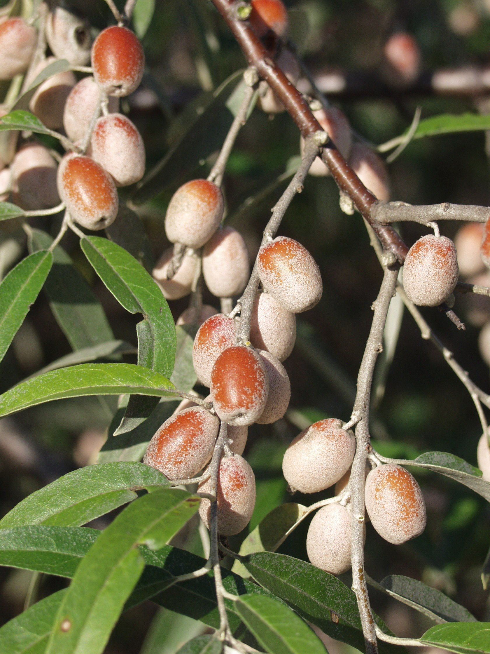 Elaeagnus angustifolia: Native to southern Europe and western Asia, Elaeagnus angustifolia is commonly found growing along floodplains, riverbanks, stream courses, marshes, and irrigation ditches Seedlings are tolerant of shade and the plant thrives in a variety of soil and moisture conditions, including bare mineral substrates.E. angustifolia can withstand competition from other shrubs and trees and can spread vegetatively by sprouting from the root crown and sending up root suckers. The fruits float and are probably dispersed via water transport. Also, the seeds ingested with the fruit by birds and small mammals are dispersed in their droppings. (Credit: Global Invasive Species Database) |