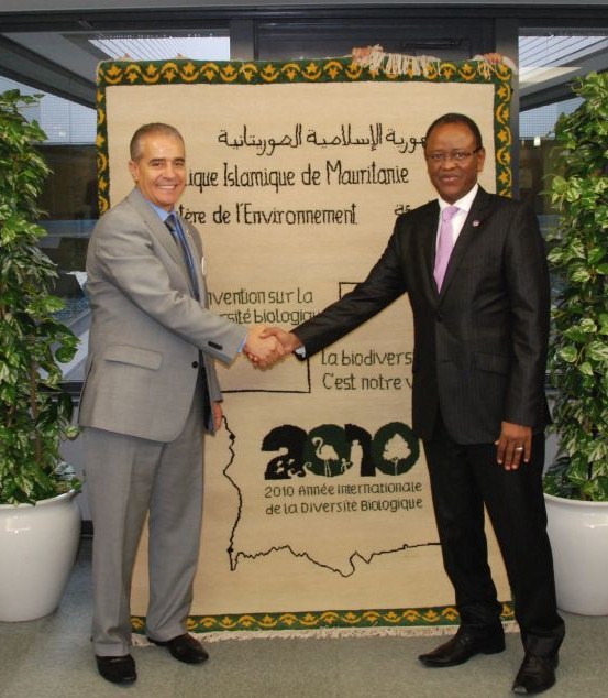 Welcome to the CBD Secretariat The CBD Secretariat About the Secretariat Role StructureContact Us Staff Executive Secretary DivisionsFormer Executive Secretaries Initiatives Museum of Nature and Culture Greening of the SCBD Documents Reports ActivitiesMonthly Bulletin of Activities Employment and Business Opportunities Employment Opportunities Business Opportunities Secretariat // Museum Tuesday // 12.14.2010 Click here to return to gallery... Title: Mauritania donates to the CBD Museum Description: Ahmed Djoghlaf, CBD Executive Secretary, receives from the Environment Minister of Mauritania, a carpet adorned with the IYB logo and theme, in the margins of the COP10 meeting in Nagoya, Japan. Date: 2010-10-18 Credits: Secretariat of the Convention on Biological Diversity Download full image: dsc_0209b.jpg (132 Kb)